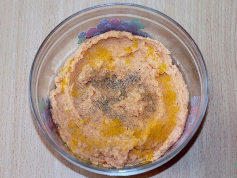 Готовим крем. Предварительно отваренный и почищенный картофель нужно размять, добавить в него кетчуп, карри, сливочный сыр, мягкое масло, кориандр, соль и перемешать (можно с помощью блендера), затем разогреть в микроволновке. Крем должен быть однородным и густым, без комочков. Обязательно дай крему остыть. Пока крем остывает, можешь скоротать время, изучая рецепт американских пончиков от тети из Флориды.
