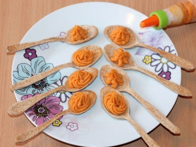 Последний штрих! Наполни ложечки подготовленным кремом из картофеля. Исходя из количества ингредиентов у тебя должно получиться примерно 25 порций.