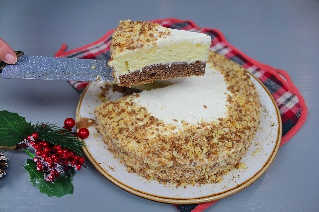 У меня форма была больше, поэтому бисквит не сильно поднялся. Если возьмете форму 20 см, тогда каждый бисквит разделите на 2 части.
