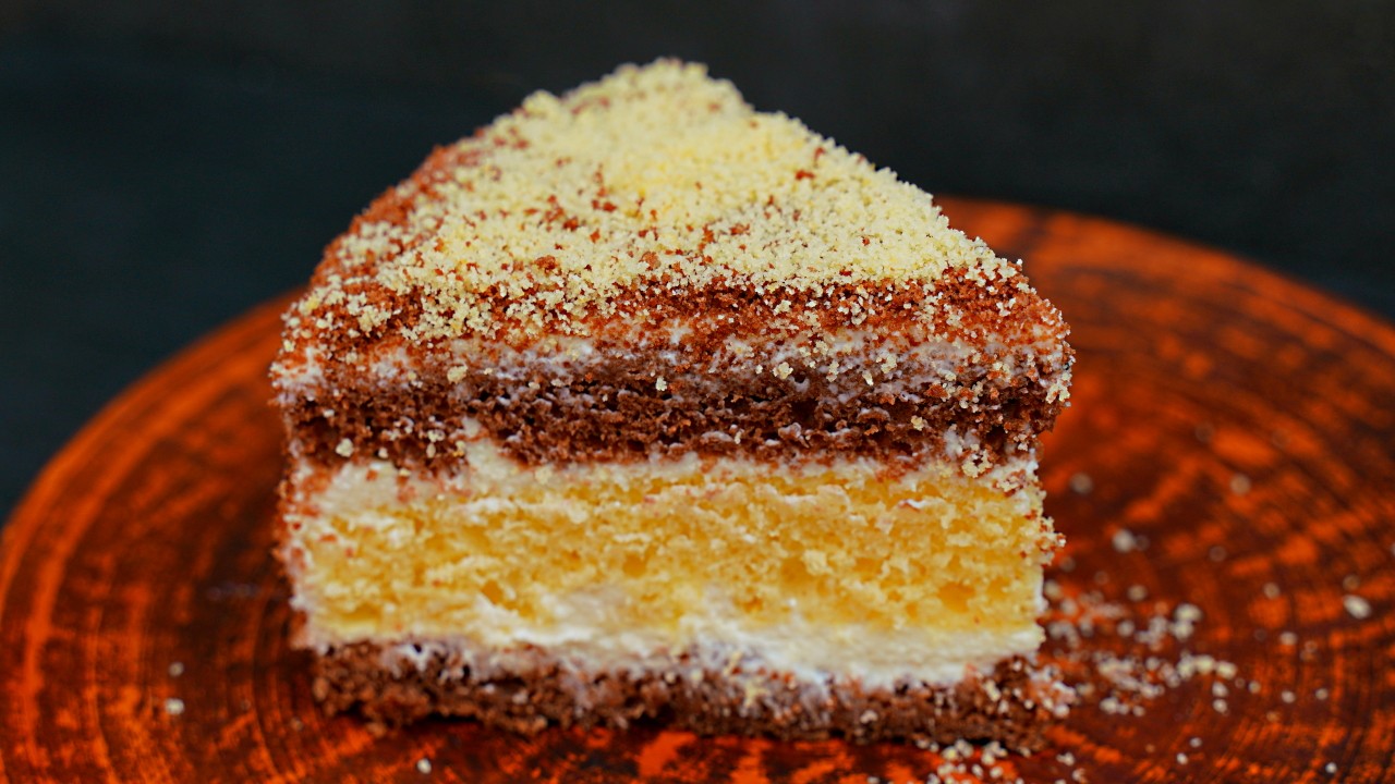 4. Шоколадный корж разрезать пополам, смазать коржи кремом, чередуя: шоколадный, белый, шоколадный. Верх и бока торта смазать сметанным кремом и посыпать крошкой из обрезков коржей.