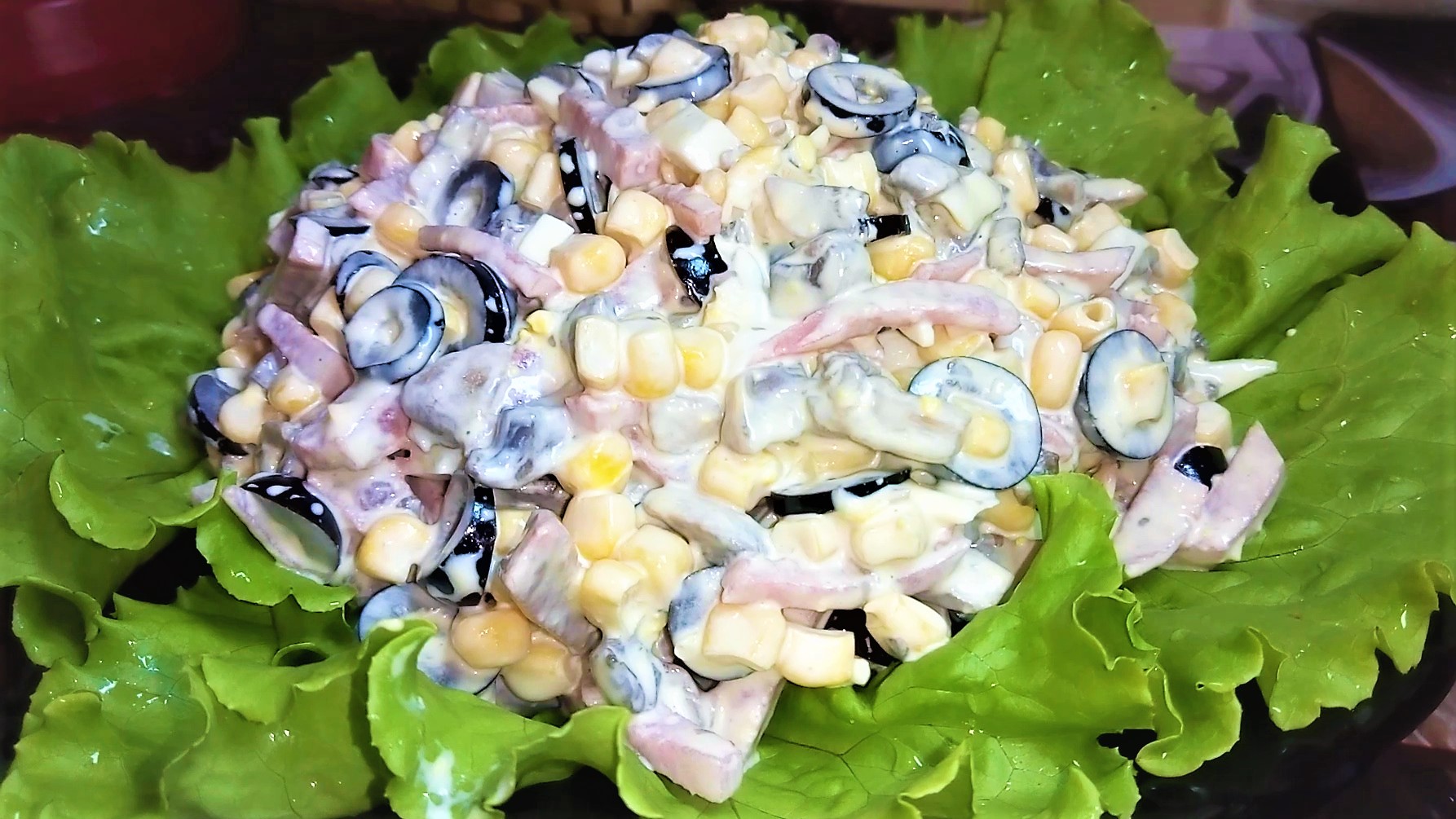 2) В миске смешайте все подготовленные ингредиенты, добавьте кукурузу, заправьте майонезом, перемешайте. Выложите горкой в салатник который предварительно накрыли листьями салата.