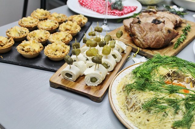 В этот раз у меня в новогоднем меню: 3 закуски, 3 салат и 1 очень горячее. 3 закуски: закусочные пирожные, тортилья с маринованным огурцом, жульен в тарталетках. 3 салата: Салат с грибами и курицей, Овощной, Салат с сельдью, картофелем и свеклой. И очень вкусное горячее Свинина с черносливом.