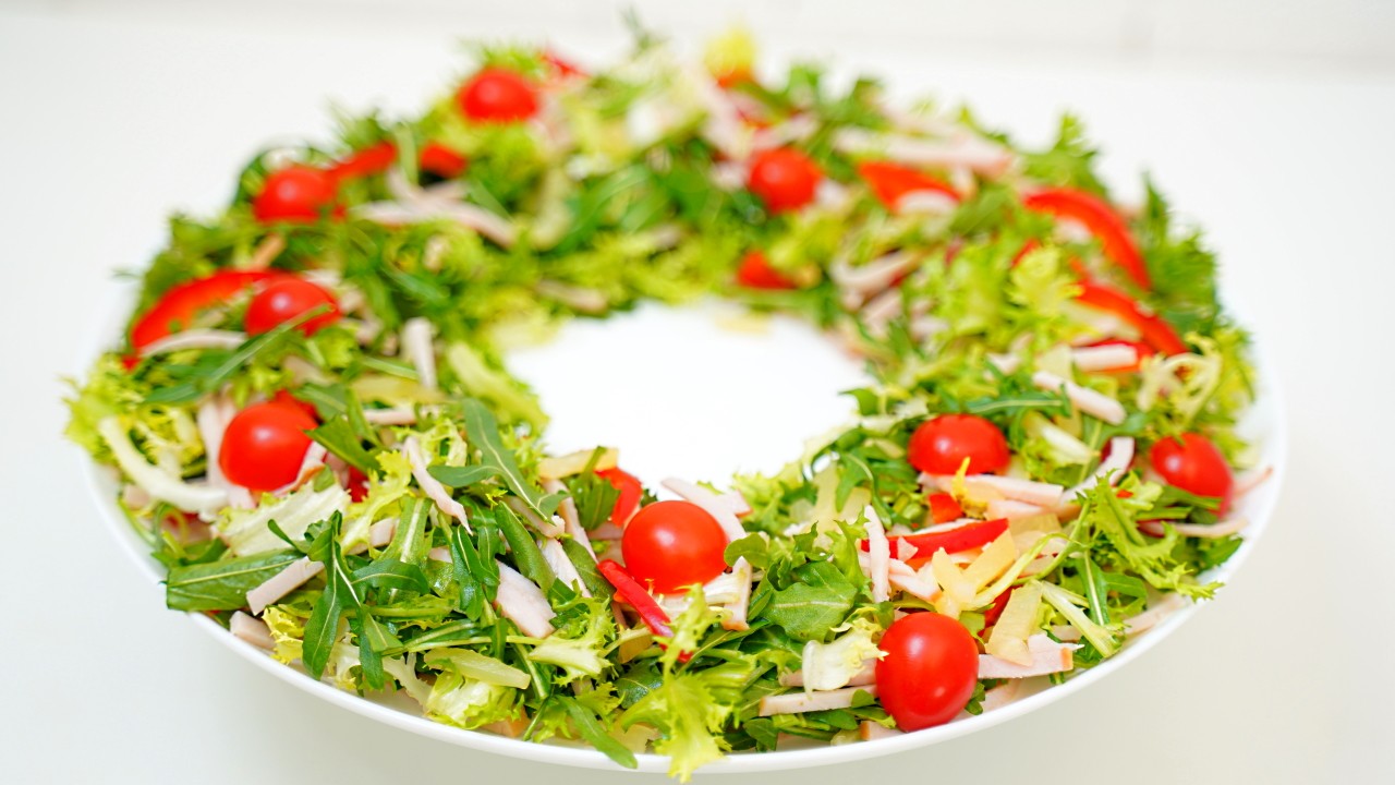 3. Салат выложить в форме венка, полить соусом перед подачей. Украсить половинками помидоров черри.