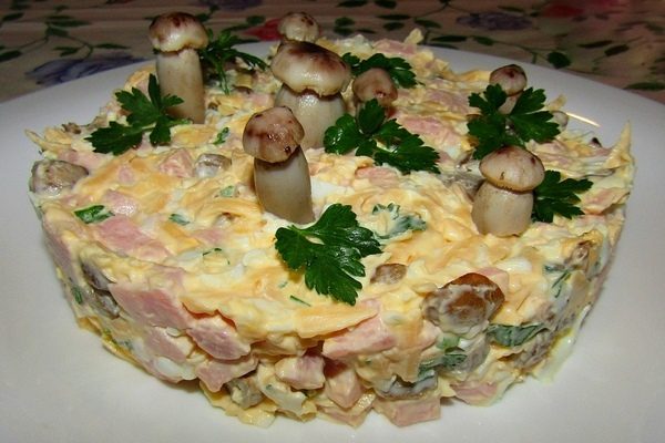 Салат с ветчиной, грибами и сыром – вкусный и очень сытный. Прекрасно смотрится на любом праздничном столе, всегда съедается первым.