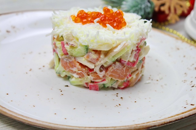 Подавать такой салат я буду порционно. Для этого в кольцо укладываю салат, сверху посыпаю натертым белком. Украшаю икрой.