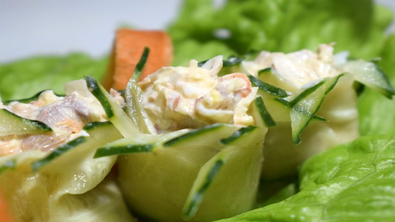 7. На один конец огурца выкладываю чайную ложку приготовленной начинки и сворачиваю рулетом.