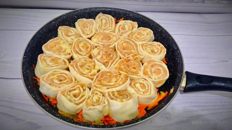 Раскатать тонкий пласт и выложить на него половину начинки.