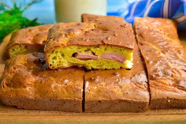 Заливной пирог можно приготовить не только с сосисками и сыром, но еще и с зеленым луком, вареными яйца, рыбой, мясом.