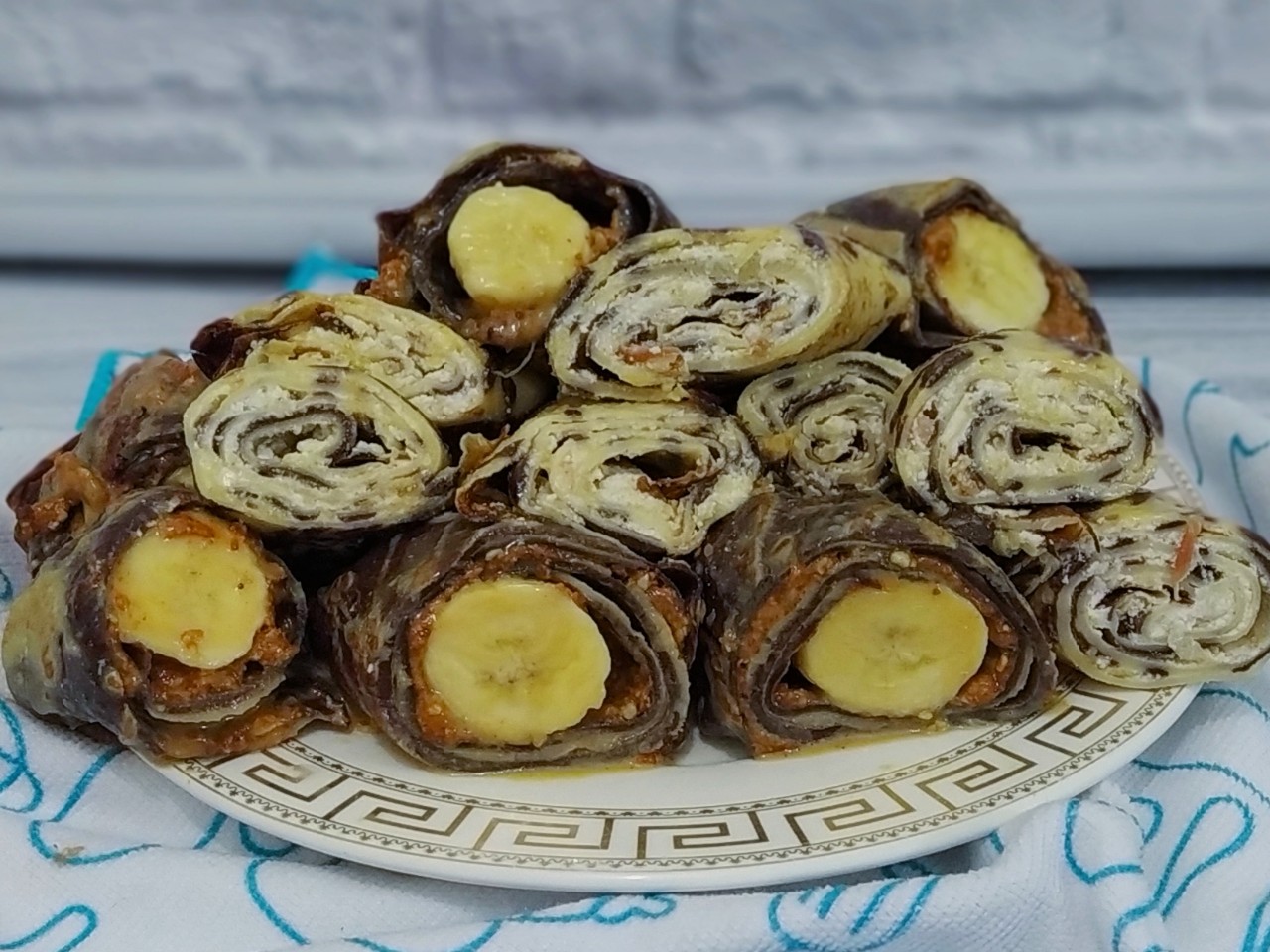 Шоколадные 2 блинчика смазать сгущенкой. Посыпать орехами, выложить банан, и свернуть в плотный рулет. Нарезать на порционные рулетики. Всем приятного аппетита.