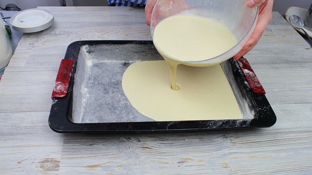 Беру противень, к меня 23*35 см. Промазываю сливочным маслом и обсыпаю мукой.