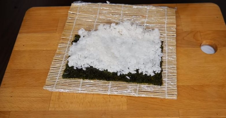 Циновку для суши можешь предварительно обернуть пищевой пленкой для комфортной работы. Можно смазать сверху капелькой растительного масла, чтобы рис не прилипал.Половинку листа нори положи на циновку. Сверху помести рис таким образом, чтобы он на 1 см выступал с одного края листа и на 1 см не доходил до конца другого края. Чтобы рис не прилипал к рукам, смачивай их водой.
