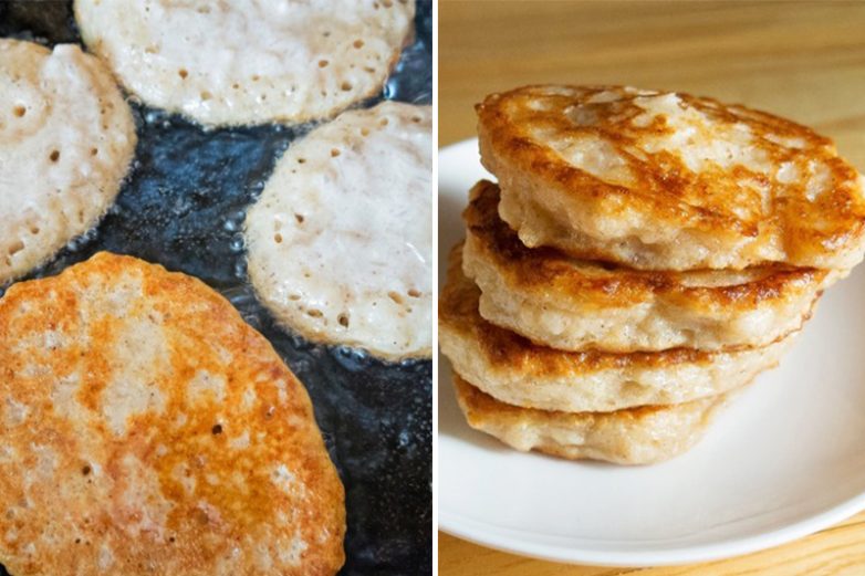 По истечении получаса вбей в тесто 2 яйца и посоли по вкусу. Если тесто жидковато, можешь смело добавить еще немного муки. Оставь тесто постоять еще на 15 минут, если есть время.Разогреваем сковороду с маслом и выкладываем 1–1,5 ст. л. теста на одну оладку. Обжариваем до румяности с двух сторон на среднем огне. Оладьи из гречневой крупы будут выглядеть немного иначе.