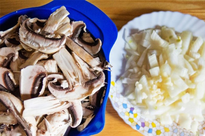 В то время как первый раз подходит тесто на оладьи, можешь приготовить мясо с грибами. Для начала нарежь грибы тонкими пластинами, лук — кубиками, а чеснок — маленькими кусочками.