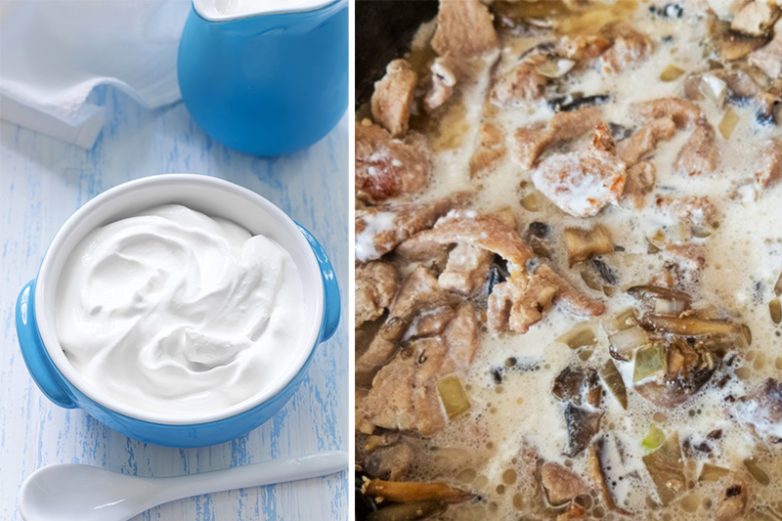 Добавляем соль, перец по вкусу и вливаем сметану со сливками. Перемешиваем мясо с грибами до однородности и после закипания убавляем огонь до среднего. Накрываем мясо с овощами крышкой, тушим 2–3 минуты и выключаем.