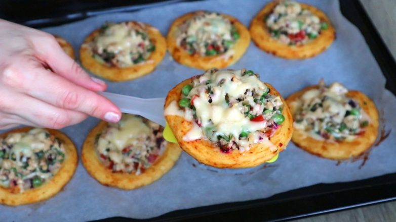 Отварной картофель превратить в пюре. Остудить. Добавить яйцо, горчицу, соль, муку. Перемешать. Влажными руками сформировать 8 «колобков». На противень с пергаментом разложить кругляшки картофельного теста и приплюснуть рукой. Сделать небольшое углубление стаканом.