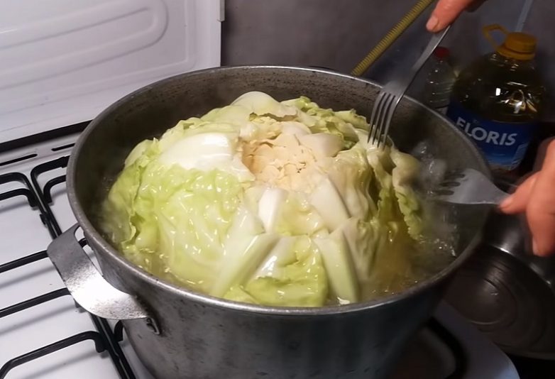 Чтобы листья хорошо заворачивались, кочан требуется проварить, а перед этим вырезать кочерыжку. Если прожилки на листьях слишком толстые, лучше отбить листья деревянным молотком.