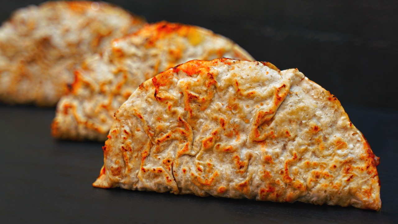5. Перевернуть лепешку, смазать кетчупом, посыпать луком, маринованным огурцом, сыром. Свернуть лепешку пополам. Обжарить с каждой стороны по 1-2 минуте.