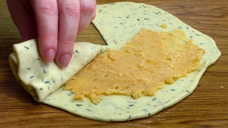 Каждый кусочек дрожжевого теста раскатываем в тонкий пласт, смазываем гороховой начинкой и сворачиваем как показано в видео.