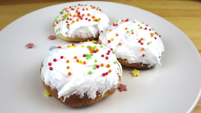 Готовому печенью дала остыть. Покрыла печенье глазурью и посыпала сверху кондитерской посыпкой.