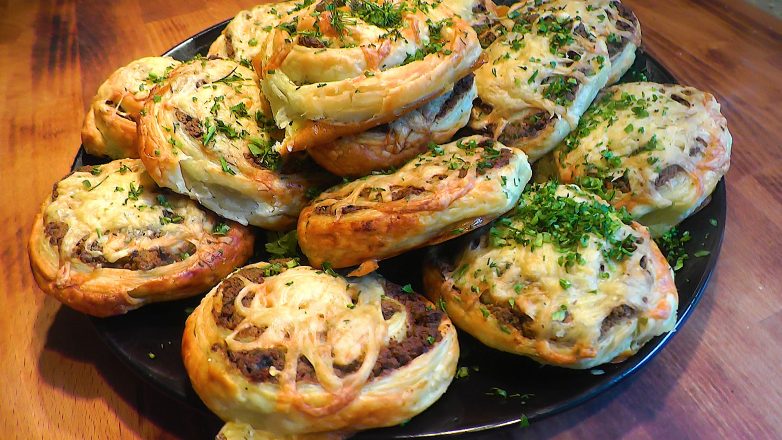 Сегодня сделаем самые быстрые и вкусные пирожки – рулетики из слоенного теста.