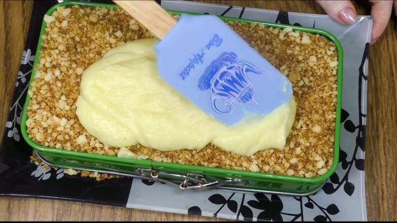 Собираем торт в разъемной форме выкладывая слоями заварной крем и крамбл.