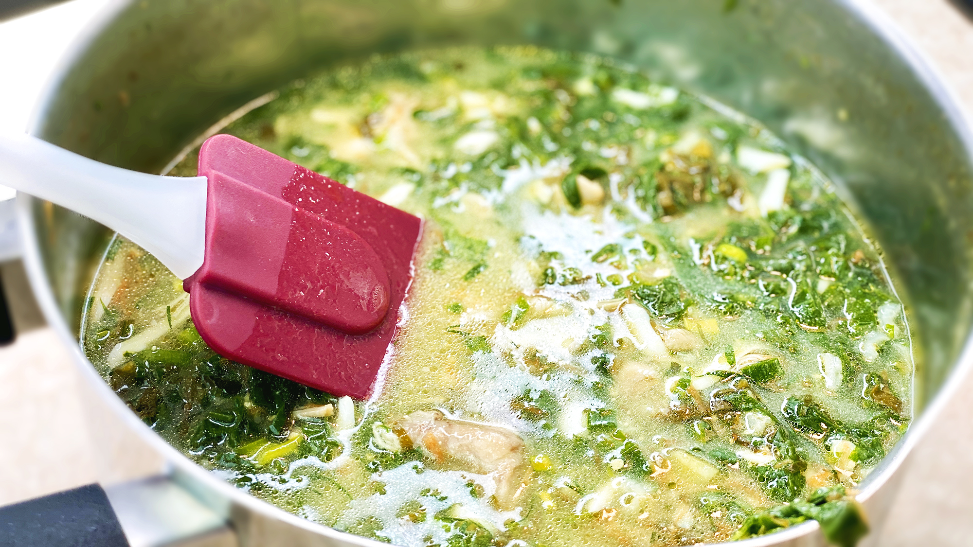Борщ со щавелем, шпинатом, зеленым луком и яйцом