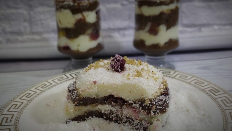 Первый слой белый или черный, затем орехи, печенье или бисквит. Ягоды или фрукты.
