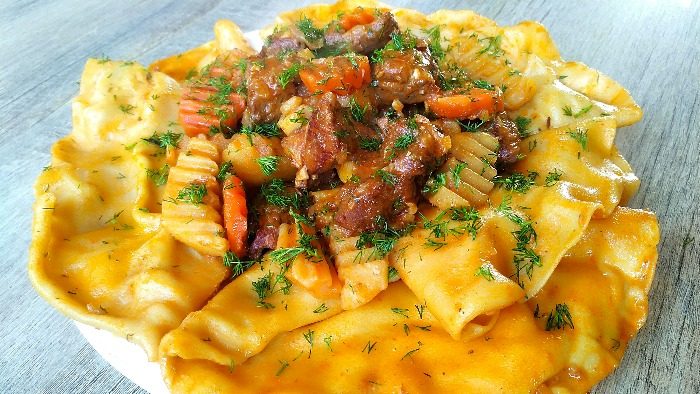 Когда картофель стал мягким и готовым к употреблению, снять сверху него подливку (до 200 мл.), стараясь максимально захватить масло/жир, если его мало, добавить немного растительного масла. На картофель с мясом уложить пласт теста, полить подливкой, так чтобы все тесто было покрыто жидкостью, сверху второй пласт теста, полить подливкой и третий пласт теста, сверху подливка. Накрыть крышкой и протушить 10-12 минут, до готовности теста.