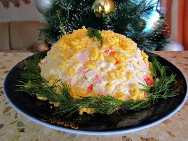Подготовить все ингредиенты. Яйца отварить в течение 10 минут и охладить в холодной воде, почистить. Крабовые палочки мелко порезать. Яйца, плавленый сыр и чеснок потереть на мелкой терке. Соединить в глубокой тарелке все ингредиенты, при необходимости (если сыр не очень соленый) добавить соль, майонез и перемешать до однородного состояния. Салат выложить горкой на блюдо и украсить зеленью укропа. Несмотря на то, что салат очень прост в приготовлении, он очень вкусный и универсальный. Его можно выложить в тарталетки или просто выложить горкой на блюдо и украсить зеленью укропа и половинкой желтка. Салат с крабовыми палочками и плавленым сыром можно сразу после приготовления подавать к столу. Более подробный рецепт приготовления салата смотрите на видео. Приятного аппетита!