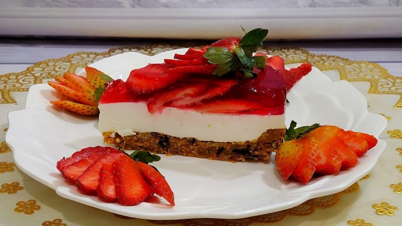 Клубнику или другие любые фрукты порезать, и красиво выложить на верх торта. Ложкой залить немного фрукты, чтоб они немного погрузились в желе. Поставить в морозилку на 30 минут. Залить оставшимся желе и оставить в холодильнике до полного застывания.