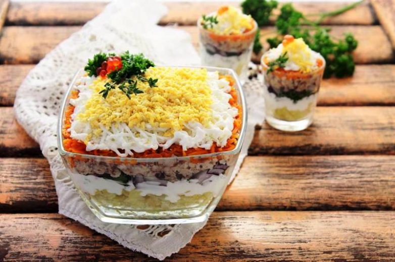 Классический вариант легендарного салата – укладка каждого продукта отдельным слоем, всего их девять.