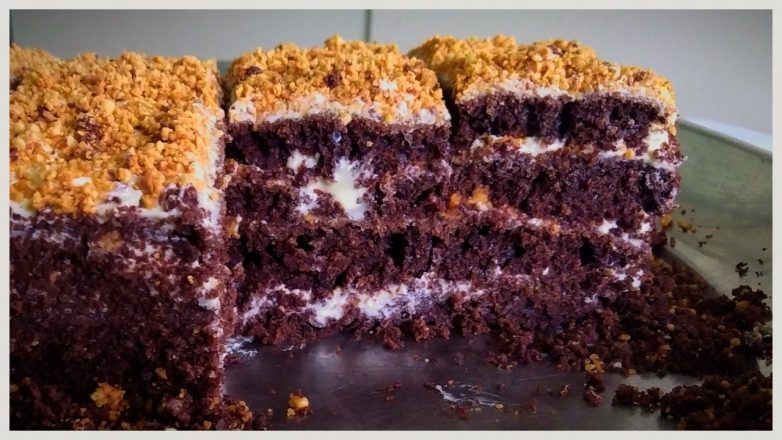 Каждый корж смазать кремом, по желанию посыпать орехами, я делала с жареным арахисом. Но можно и без орехов.