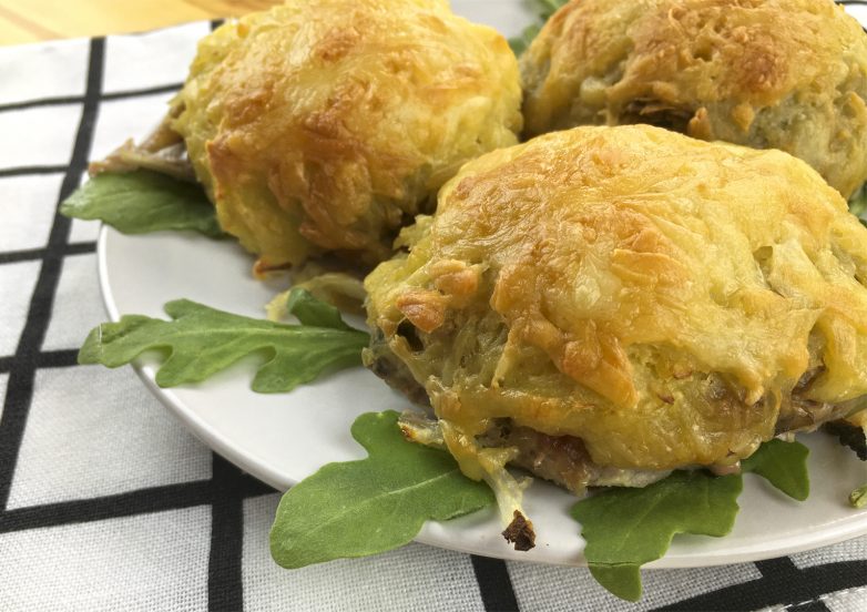 Сформировала котлеты, формой как в гамбургере и положила на «луковую подушку». На котлету положила жареные грибы, затем натертый на средней терке сырой картофель, смешанный с майонезом, а сверху все засыпала тертым сыром. Затем выпекала в разогретой до 180° духовке приблизительно 30-40 минут.