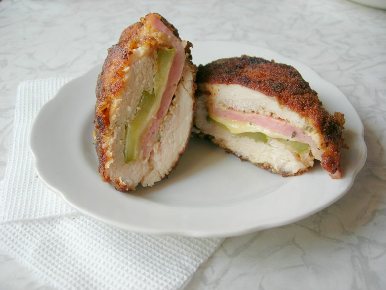 На смазанную горчицей сторону куриной грудки помещаем пластинку ветчины, сыр и слайсы маринованного огурца. Выворачиваем грудку через боковой разрез наизнанку.