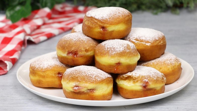 Начинки могут быть самими разными: от классической со сливовым повидлом, клубничным и малиновым джемом, а также с заварным кремом, варёной сгущёнкой или шоколадным ганашем — всё по вашему вкусу и желанию. Пончики получаются потрясающе вкусными и очень воздушными. Если у вас есть немного свободного времени, обязательно приготовьте такие пончики!