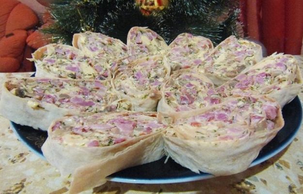 Рулет из лаваша с копченым мясом и грибами
