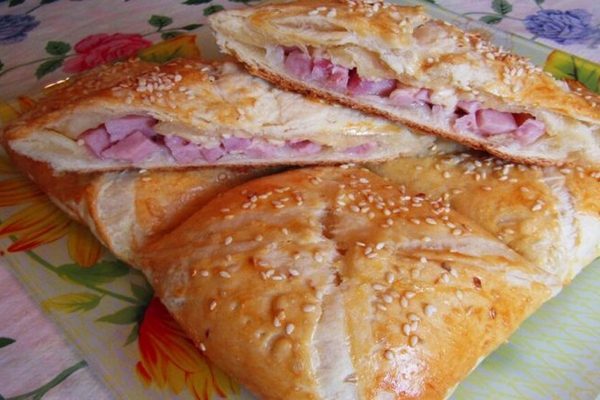 Подготовить все ингредиенты. В этом рецепте можно использовать как дрожжевое, так и бездрожжевое слоеное тесто, но при использовании дрожжевого теста конвертики получатся более воздушными. Тесто разморозить и разрезать на 8 квадратов. Ветчину порезать мелким кубиком, сыр потереть на крупной терке. Каждый квадрата теста немного раскатать скалкой, на середину квадрата выложить начинку, сначала ветчину, сверху сыр. Сложить края теста конвертиком и хорошо защипнуть. Отделить белки от желтков (в рецепте нам понадобятся только желтки). Желтки взбить вилкой и нанести кулинарной кистью на конвертики. Для того чтобы конвертики равномерно поднимались, сделать несколько проколов вилкой. Сверху конвертики посыпать кунжутом и отправить в предварительно разогретую до 180 градусов духовку до зарумянивания (на 25 – 30 минут). Готовые слоеные конвертики употребляют как в горячем, так и в холодном виде.