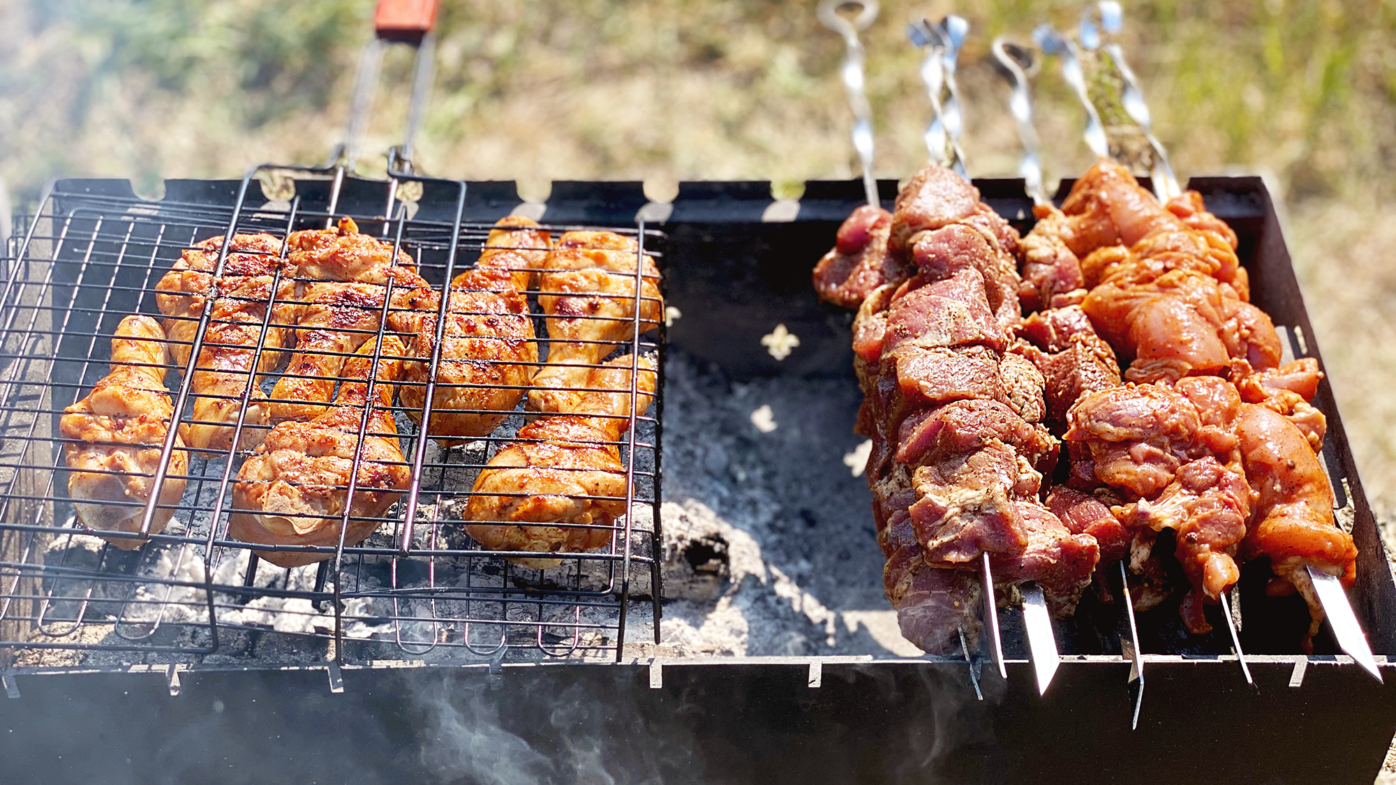 Готовим на природе шашлык из курицы и свинины. Рецепт вкусного маринада для шашлыка и как правильно жарить мясо на углях. Все секреты приготовления и тонкости. В этом видео-рецепте я использовал три вида мяса — куриное бедро без кости, куриные голени и свиная шея. Это мой любимый мясной микс.
