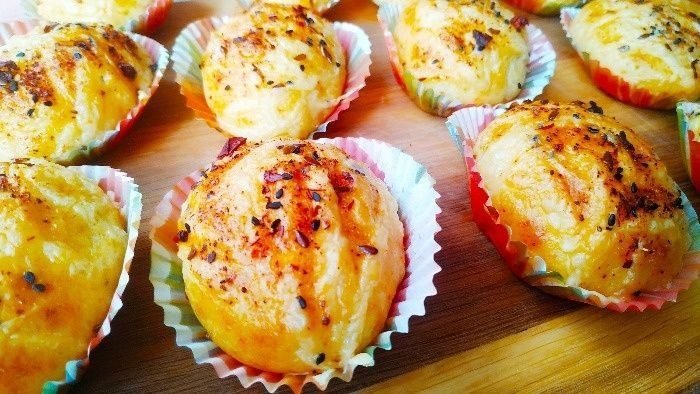 Разделить тесто на 12-13 частей, весом 49-50 гр. каждая. Сформировать продолговатые булочки, поместить их в бумажные формочки для кексов. Смазать взболтанным желтком с молоком. Посыпать тертым твердым сыром и специями.