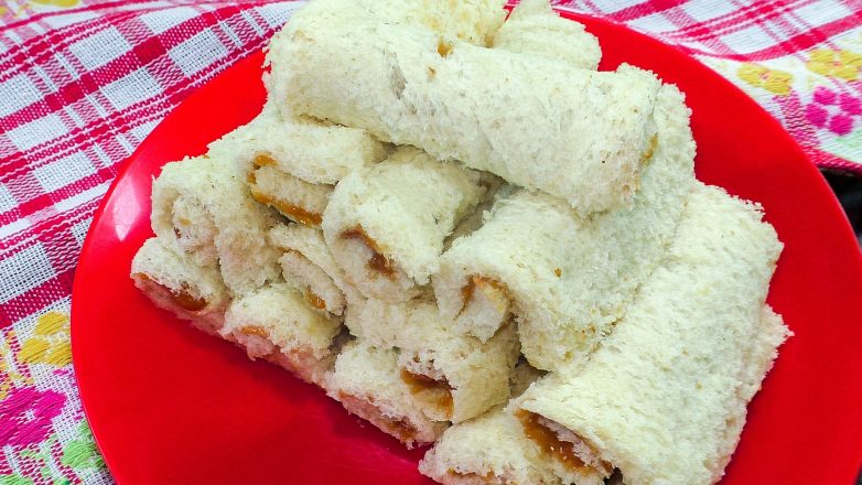 Со свежего белого хлеба срезаю корочку.Получившиеся кусочки раскатываем скалкой.