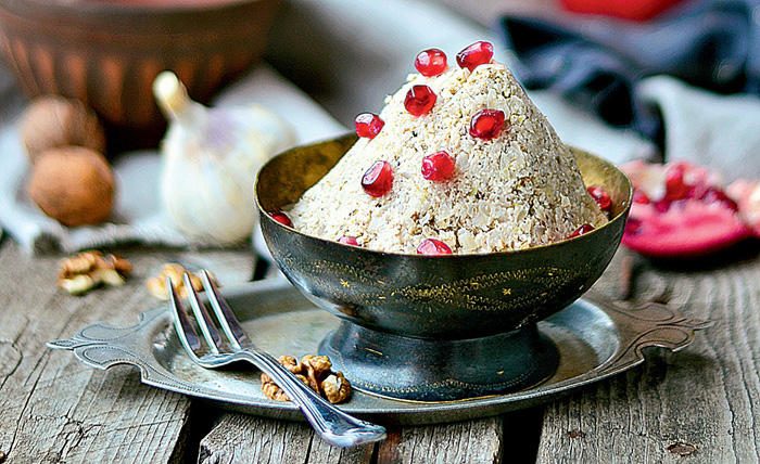 Закуска, которую готовят из говяжьих или куриных потрохов: сердца, печени, легких. Субпродукты сначала отваривают, а затем обжаривают с кориандром, перцем, чесноком, толчеными грецкими орехами и свежевыжатым гранатовым соком.