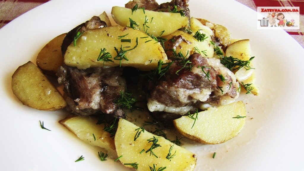 Блюдо готовится очень просто, получается сытным и вкусным. Картофель можно брать любой. Если берете молодой картофель, его достаточно помыть и порезать на половинки или четвертинки в зависимости от его размера. Если берете старый картофель то его нужно очистить и порезать. Свиные ребра нужно выбрать с минимальным количеством жира, можно использовать и говяжьи ребра, но тогда время приготовления нужно увеличить. Картофель помыть, порезать на произвольные кусочки. Свиные ребра помыть, обсушить и порезать на порционные кусочки. Чеснок порезать пластинами. Все ингредиенты поместить в глубокую миску, добавить соль, черный молотый перец и хорошо перемешать. Все ингредиенты поместить в рукав для запекания, рукав завязать или закрыть клипсами, сверху сделать несколько проколов для выхода пара. Рукав поместить в жаропрочную форму и отправить в предварительно разогретую до 180 градусов духовку на 1 – 1,5 часа, в зависимости от вашей духовки. Готовый картофель со свиными ребрами выкладываем на блюдо и подаем к столу, по желанию можно сверху посыпать рубленной зеленью. Картошка со свиными ребрами запеченная в духовке в рукаве готова! Более подробный рецепт приготовления смотрите на видео. Приятного аппетита!