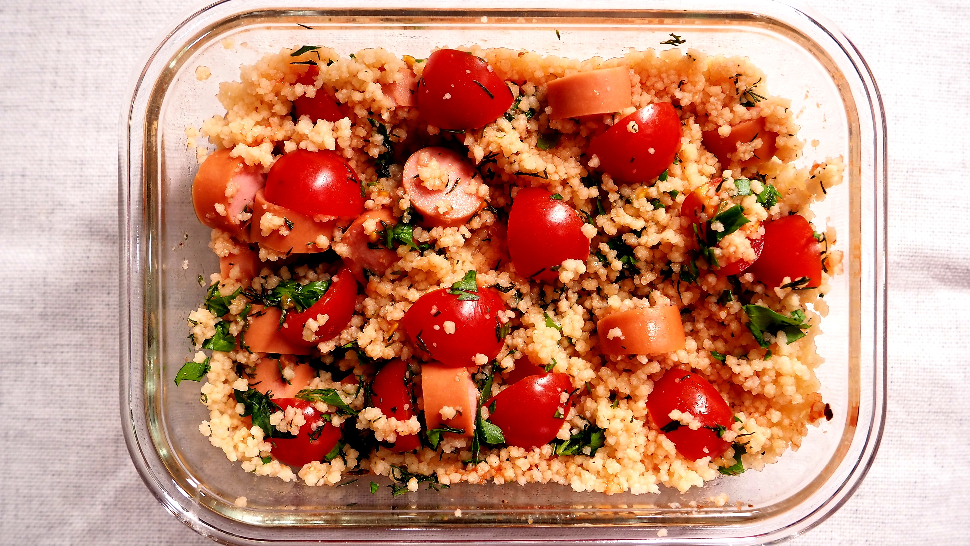 3. На работе во время обеда в большой контейнер с кускусом залить кипяток так, чтобы он покрывал кускус на 1 см.