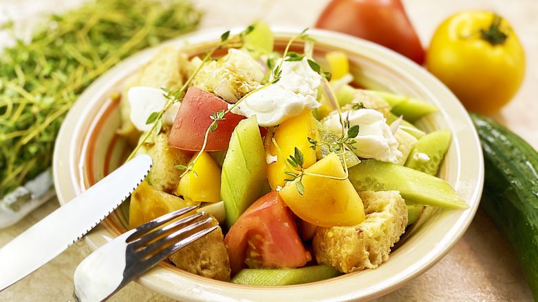 Вкусный овощной салат с сыром и сухариками