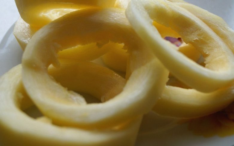 Хорошо перемешиваем всю массу и начинаем заниматься подготовкой кабачка. Для этого очищаем шкурку, удаляем семена и нарезаем кабачок на кольца толщиной около 2 см.