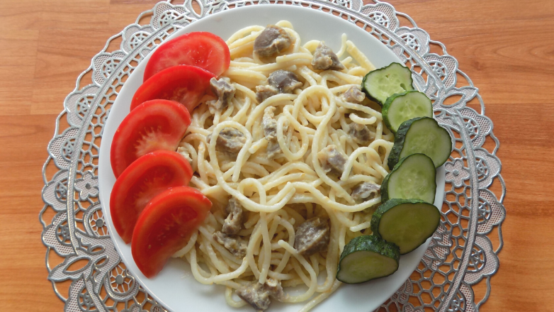 Тушеные в сметане куриные желудки со спагетти