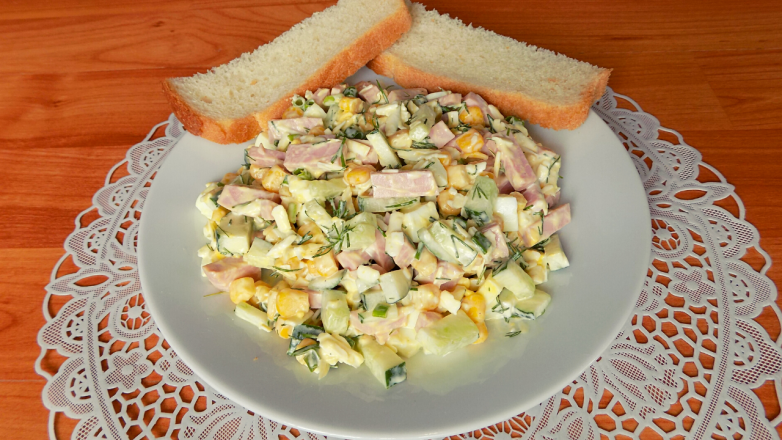 5. Смешиваем все подготовленные продукты в миске и добавляем консервированную кукурузу без жидкости.