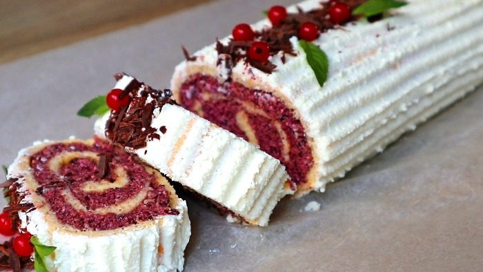 Свернуть в рулет, затем завернуть в пергамент и отправить в холодильник на 30-60 минут, лучше на ночь пропитаться. Украсить по своему вкусу. Я сверху смазала перебитым творогом со сметаной и ванильным сахаром, украсила рубленым шоколадом, листиками мяты и смородиной.