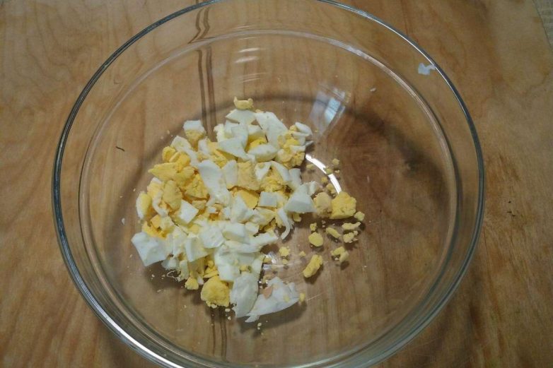 Мелко нарежь зелень, посыпь щепоткой соли и немного перетри.Нарежь кубиками вареную колбасу. Можно заменить ее куриным филе.Смешай все нарезанные продукты в миске.