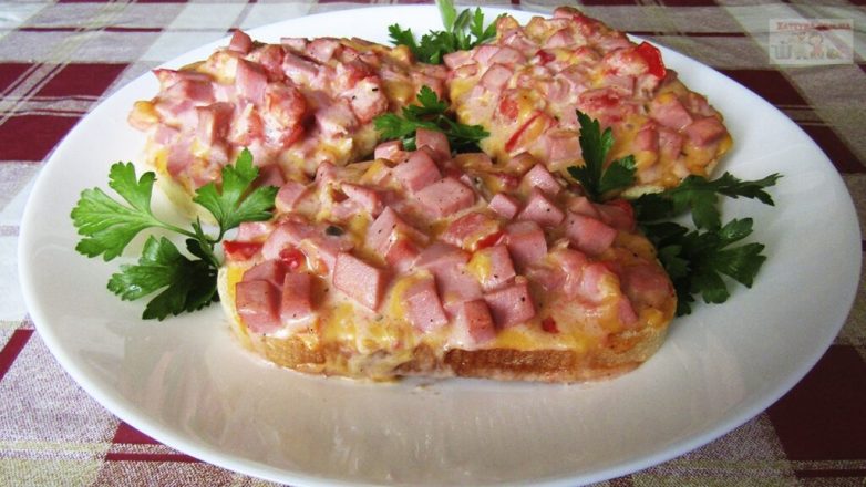 Начинка готовится очень быстро, поэтому сразу включаем духовку и разогреваем ее до 180 градусов. Вместо ветчины можно использовать колбасу или сосиски. Ветчину и помидоры режем мелким кубиком, сыр трем на крупной терке, чеснок пропустим через пресс. Всю начинку отправляем в глубокую миску, добавляем майонез и тщательно перемешиваем. Можно вместо майонеза добавить сметану, но с майонезом вкуснее. Кладем начинку на батон и отправляем кусочек батона на противень, предварительно застеленный бумагой для выпечки. Отправляем противень в предварительно разогретую до 180 градусов духовку на 8 – 10 минут. Достаем бутерброды из духовки и употребляем в горячем виде – быстро, вкусно и доступно! Горячий бутерброд со вкусом пиццы готов! Более подробный рецепт приготовления смотрите на видео. Приятного аппетита!